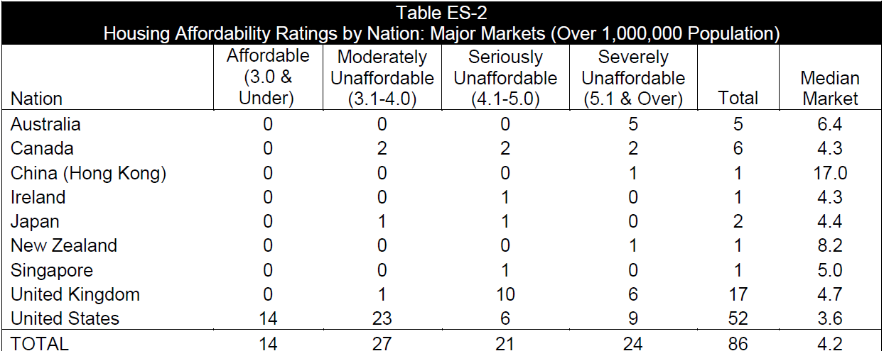 Whilst the UK may be a relatively extreme case, a broader view of “housing affordability” is shown in the Table below (Source: Demographia International Housing Affordability Study, 2015 based on figures for Q3 2014 for major metropolitan areas).