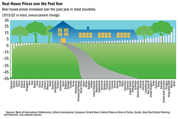 - Economies that are highly dependent on commodity prices and /or which have falling growth rates are most at risk in terms of a downturn in residential real estate prices