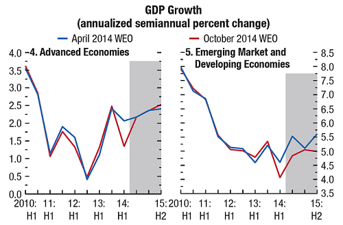 As will be seen from the following graphs (Source: IMF World Economic Outlook, October 2014) there has been an improvement in the overall economic environment but the position in Advanced and Developing Economies is quite different.