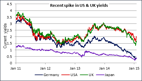 Even where economic growth is improving bond yields are very low as shown in the chart below (Source: Money Week)