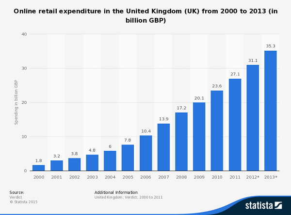 Source: http://www.statista.com/statistics/283165/online-retail-expenditure-in-the-united-kingdom-uk/