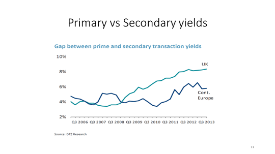If trends follow past economic cycles the scope for returns from yield compression in Prime Real Estate Investments may however now be becoming more limited even where yields are higher than on comparable investments.
